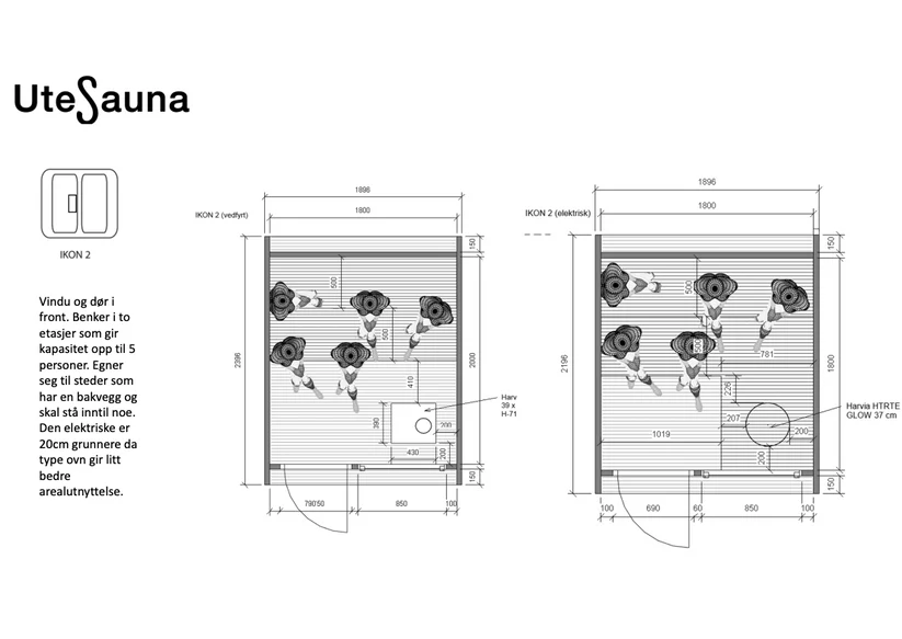 IKON 2 er saunaen for deg som vanligvis vil være en eller to i saunaen, men den har selvfølgelig rom for flere. Den har plass til 5-6 personer og er med det vår minste sauna. Den har et panoramavindu i front og en dør med vindu. Dette er en plasseffektiv løsning, som samtidig gir masse utsikt mot naturen eller omgivelsene.